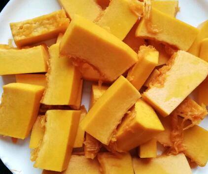 1、将南瓜去皮,去掉南瓜馕冲洗一下。切成块状,装盘备用。