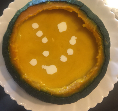 5、煮好后倒回南瓜壳中,滴几滴淡奶油用牙签拉一下花。