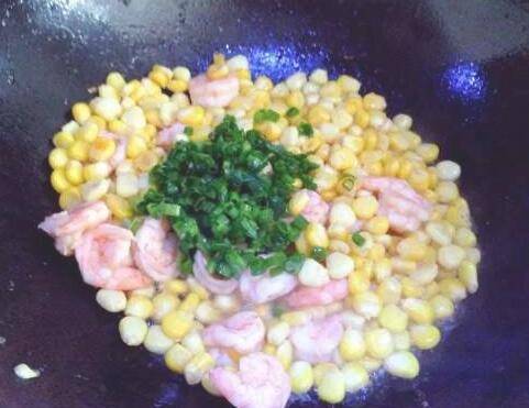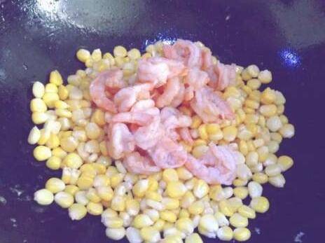 炒好玉米后,加入虾仁,翻炒均匀。