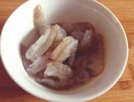 将虾仁放入干净碗里,加少量入盐、胡椒粉、蛋清(加蛋清腌过的虾爽脆)。