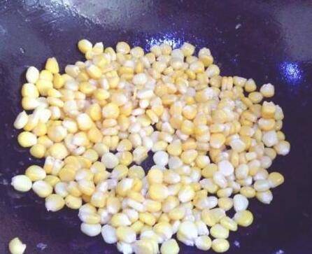 底油中加少许油,加入玉米粒,翻炒。
