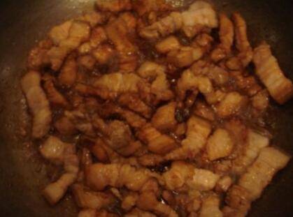 2、腊肉切成条。点火,锅中放入豆油,放入腊肉。