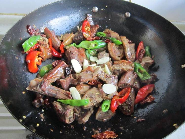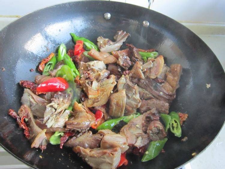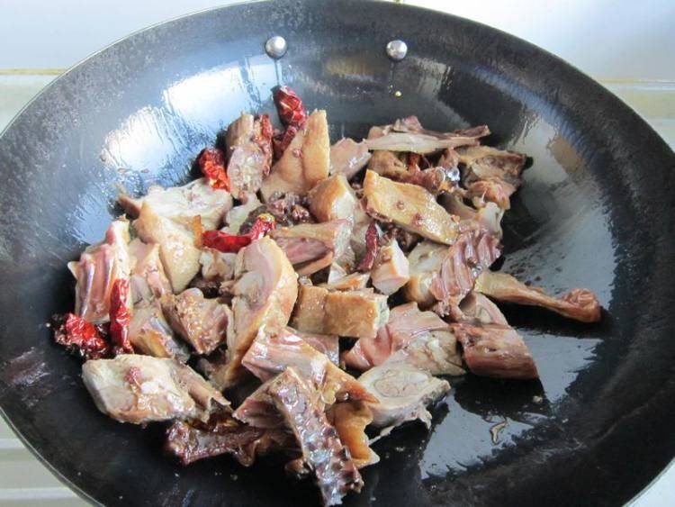 6、下卤鸭翻炒均匀,加少许水再次翻炒3分钟左右。