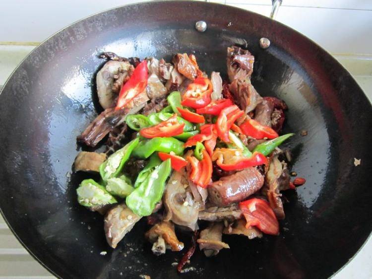 7、加青红辣椒翻炒出香味(大约2分钟)。