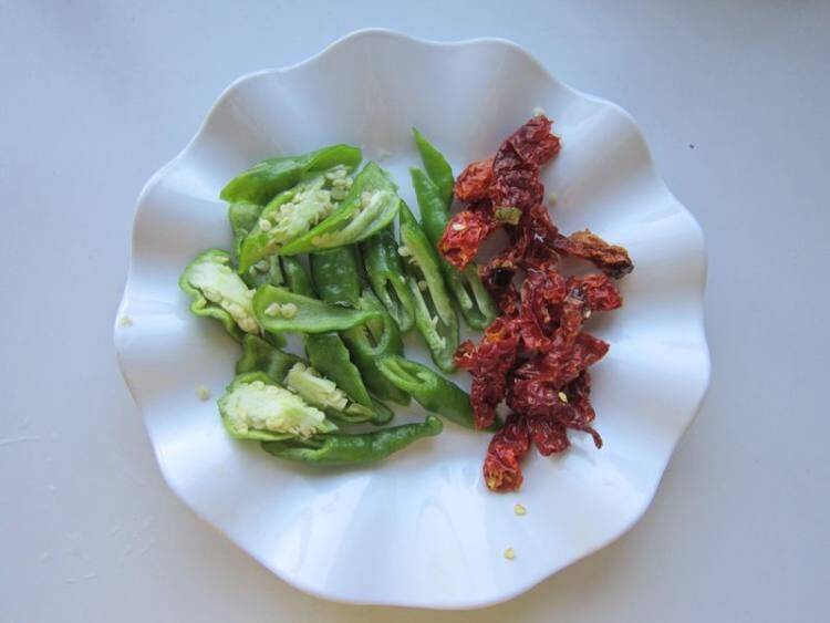 2、把辣皮子泡泡洗净切段,青红辣椒洗净切斜段。