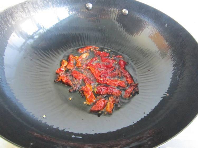 5、热锅凉油,油热7成下辣皮子、花椒粒爆炒出香味。