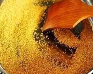 2、将一小块牛油(可用奶油代替)放置热锅中融化,放入小米或者大米翻炒,炒米应不停翻炒才能入味,炒至金黄色微糊即可。