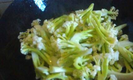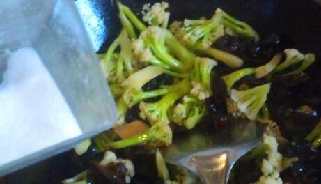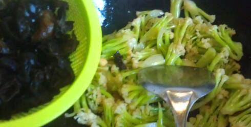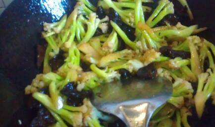 5、当炒到花菜表面可以见到微焦黄时,放入木耳一起继续翻炒至成熟。