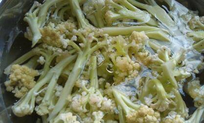 1、花菜洗净后,切成小朵,用盐水浸泡10分钟。