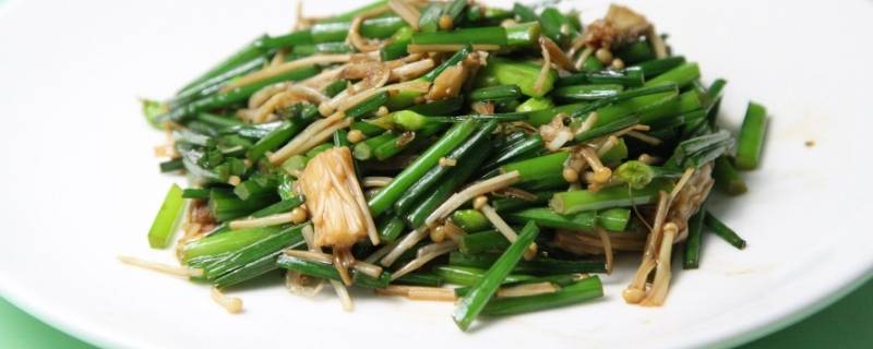 最佳答案用料:韭菜适量、金针菇适量、盐适量、鸡精少许、油适量。1.韭菜择干净,在盐水里浸泡五分钟,洗净,去掉根部,切段冲洗沥干水分备用。2.金针菇切去根部后,用盐水浸泡一会,然后扒开来反复冲洗干净备用。3.热锅倒油烧热,下入金针菇大火煸炒,至金针菇变软。4.接着,放入切好的韭菜大火翻炒。5.韭...