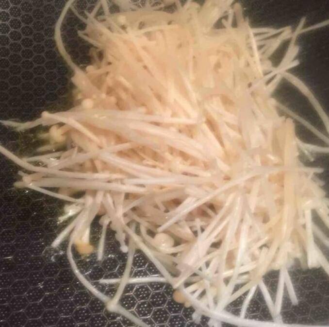 3.热锅倒油烧热,下入金针菇大火煸炒,至金针菇变软。