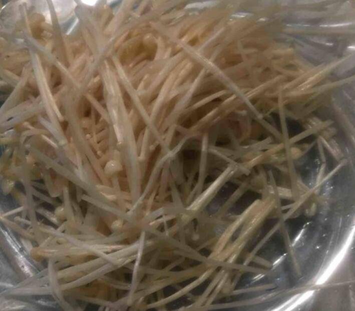 2.金针菇切去根部后,用盐水浸泡一会,然后扒开来反复冲洗干净备用。