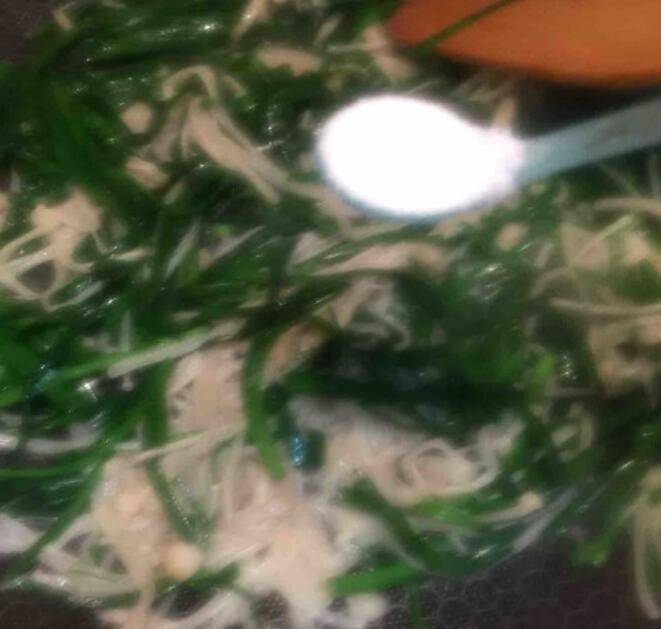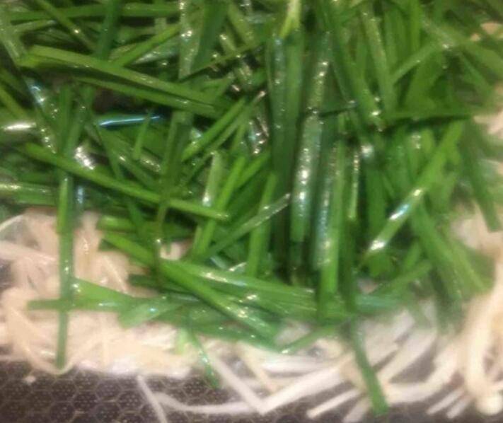 5.韭菜断生,加适量的盐少许鸡精调味炒匀即可。