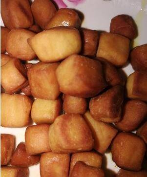 将做好的馒头,再放油锅里炒至金黄。