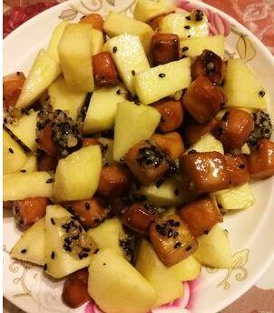 再加少许白糖芝麻,最后放入苹果丁翻炒几下即可。