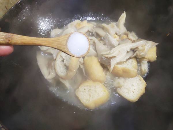 7、然后下入油豆腐,翻炒均匀。