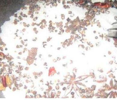 2、然后往锅里倒入准备好的盐、八角、辣椒和花椒,用铲子快速翻炒盛出。