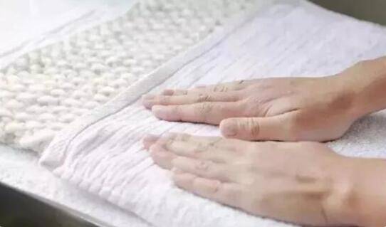 4、清洗完成后,将羊绒衣平铺,用柔软的干毛巾叠铺一层,然后用手来回挤压,使毛巾吸收多余的水分。