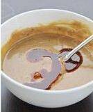 取一只大碗,放入芝麻酱,将温水一点点的加入,边加水,边用筷子朝一个方向不停的搅拌,直到把芝麻酱调到稀稠合适的状态;