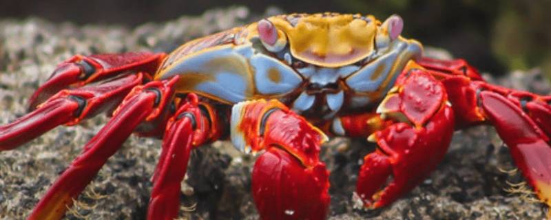 红色钳子的小螃蟹是红石蟹。是一种典型的螃蟹,五对爪,两个前爪较小,块状,螯对称,其他爪阔且平。未成年的红石蟹是黑色或深褐色,在火山岛黑色熔岩海岸是很好的伪装。成年蟹的颜色多样。一些为深棕红色,有些斑驳,或者有棕色,粉红色,或黄色斑点。热带岛屿动物的照片上看到的往往背部为明亮的橙色或红色,带有条纹或斑点,腹侧部为蓝色和绿色,爪子红色,眼睛则为粉红色或蓝色。