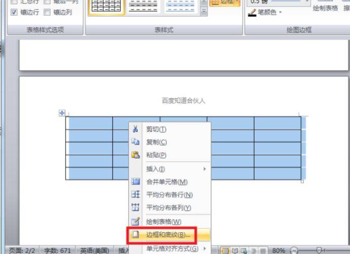 3、然后点击表格左上角的十字图标全选表格,然后点击鼠标右键,在快捷菜单中点击“边框和底纹”选项。