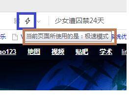 在网址后面有一个闪电的图标,表示当前网页处于极速模式。