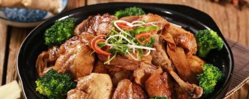 用料:姜片130克、鸭肉500克、食用油5毫升、生抽5克、老抽6克、江米酒75克、清水500毫升、冰糖12克。