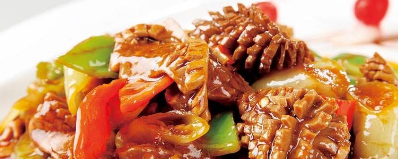 8、腰花面色,没有了鲜肉色便可放入双椒翻炒,放盐、鸡精。