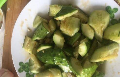 4、把黄瓜切成块,葱蒜切碎。