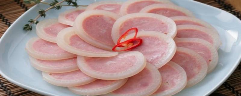 2、肘花火腿,切成厚薄均匀一致的薄片,切好的火腿片摆在盘子里,首尾相接成环状待用。