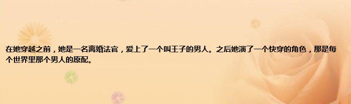 大家好,小常来为大家解答以上问题。在她穿越之前,她是一名离婚法官,爱上了一个叫王子的男人。之后她演了一个快穿的角色,那是每个世界里那个男人的原配。很多人还不知道,现在让我们一起来看看吧!