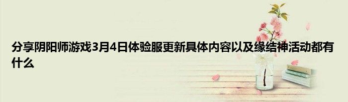 今天弟哥来聊聊一篇关于阴阳师游戏3月4日体验服更新具体内容以及缘结神活动都有什么的文章,游戏是很多人的选择,但是游戏玩多了也会身心疲惫,现在就为大家来简单介绍下阴阳师游戏3月4日体验服更新具体内容以及缘结神活动都有什么,希望对各位小伙伴们有所帮助。
