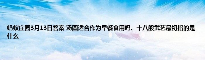 2021年3月13日蚂蚁庄园答案是什么?3月13日蚂蚁庄园的答案很多的玩家都不清楚,这两个问题有:民间常说的“十八般武艺”最初指的是什么?甜甜糯糯的汤圆,适合作为早餐食用吗?下面小编给大家介绍一下具体的答案和解析,一起来看看吧。