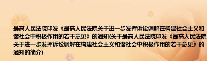 本文关于最高人民法院印发《最高人民法院关于进一步发挥诉讼调解在构建社会主义和谐社会中积极作用的若干意见》的通知的简介就讲解完毕,希望对大家有所帮助。