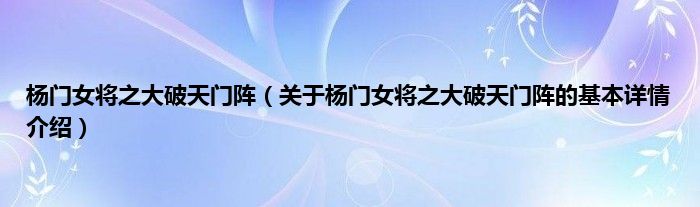 杨门女将之大破天门阵(关于杨门女将之大破天门阵的基本详情介绍)
